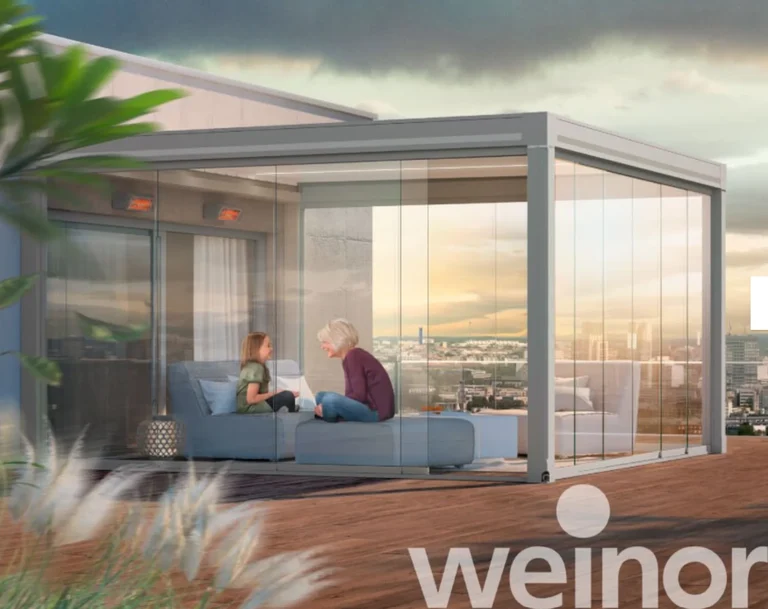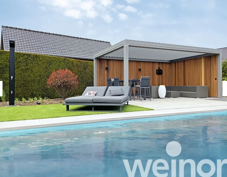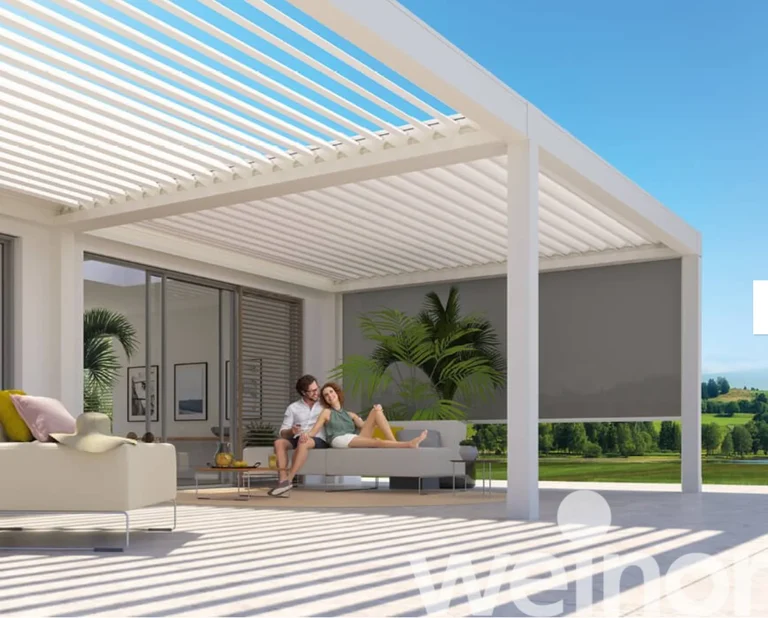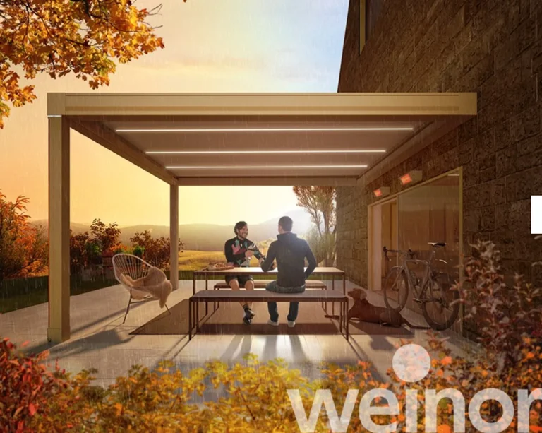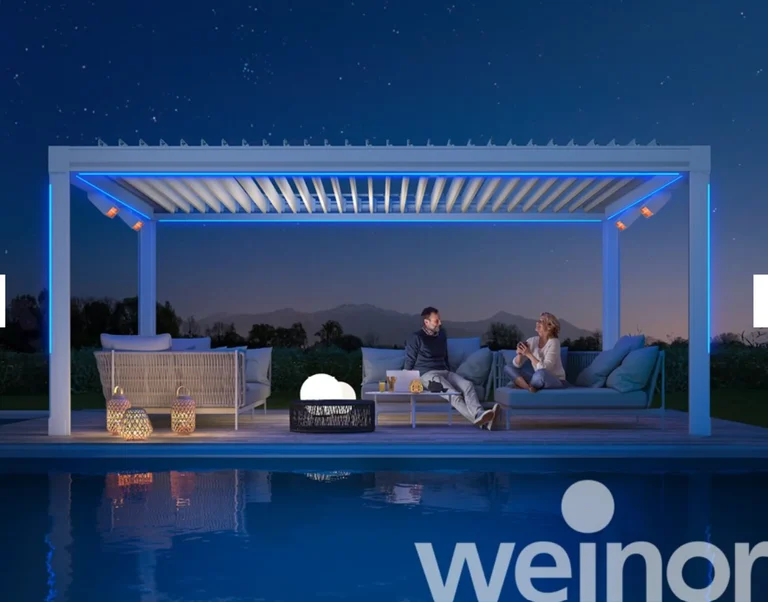 Regeln Sie ihr individuelles Bioklima einfach selbst durch den Öffnungswinkel der Lamellen. Intelligente Sensoren ermöglichen die automatische Einstellung der Lamellen je nach Wetter, damit Sie den Aufenthalt auf Ihrer Terrasse gut geschützt geniessen können. Das Wetterschutzprodukt lässt sich durch Extras wie integrierter Vertikal-Beschattung oder LED-Beleuchtung an Lamellen und Rahmen zu Ihrem individuellen Terrassenhimmel gestalten.