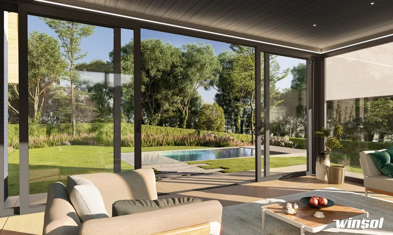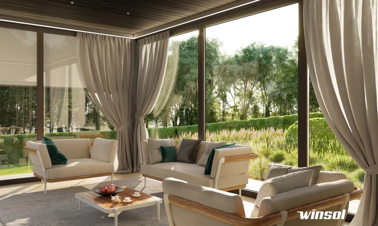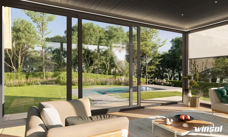 So können Sie länger draussen sitzen, auch bei schlechterem Wetter oder niedrigeren Temperaturen. Noch bessere Isolierung und mehr Schutz dank Kombination mit Aluminiumfenstern mit Doppelverglasung.