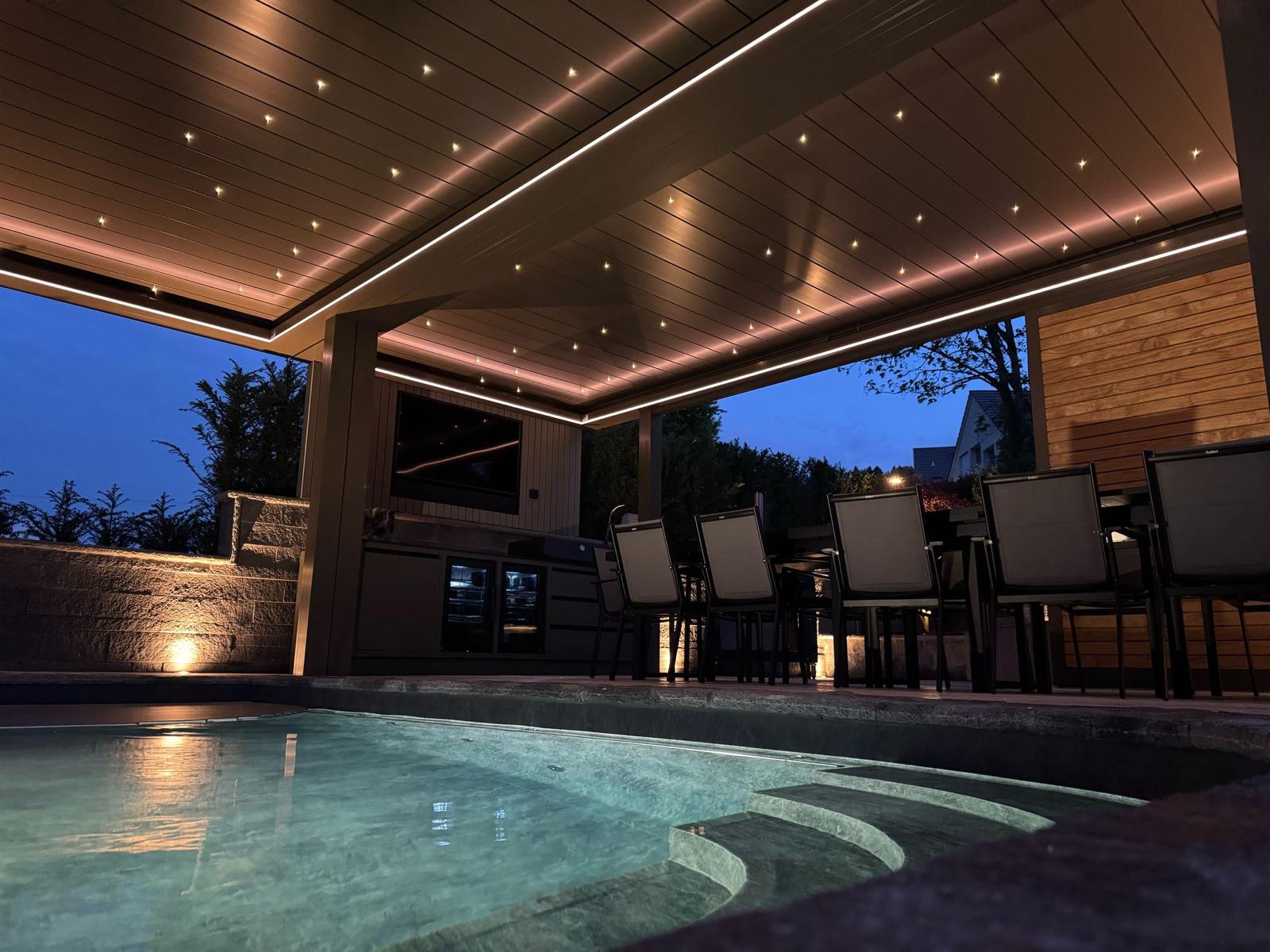 Sie lieben Filme und wollten schon immer ein eigenes Kino haben? Richten Sie sich doch einfach ein Heimkino unter Ihrer Pergola ein! Mit Beamer-Halterung, Screens und Steckdosen bietet Ihre Pergola alles, was Sie brauchen, um den ganzen Tag lang draussen Ihre Lieblingsserien und -filme zu geniessen.Lieber einen Spieleabend mit Freunden? Dank der dimmbaren LED-Beleuchtung können Sie selbst die Lichtintensität bestimmen. Oder entscheiden Sie sich für eine RGB-Beleuchtung, wie bei Ihrer Gaming-Tastatur.